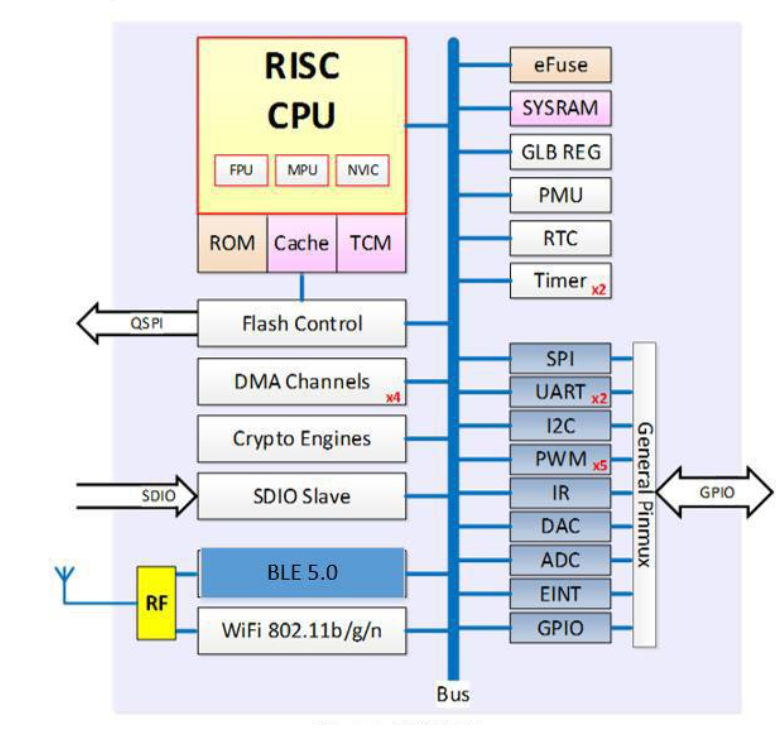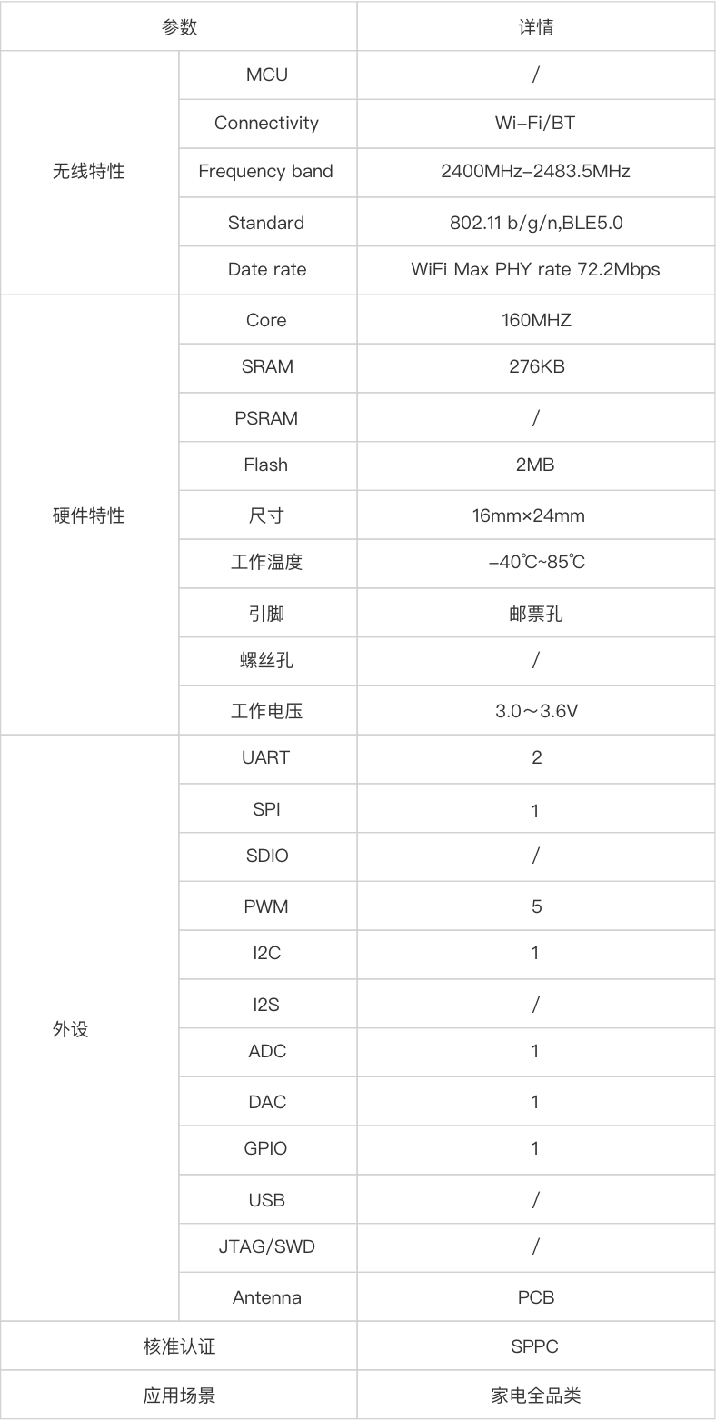 802.11b/g/n,Wi-Fi+Bluetooth LE5.0 Combo,支持 STA,Soft AP 和 Sniffer