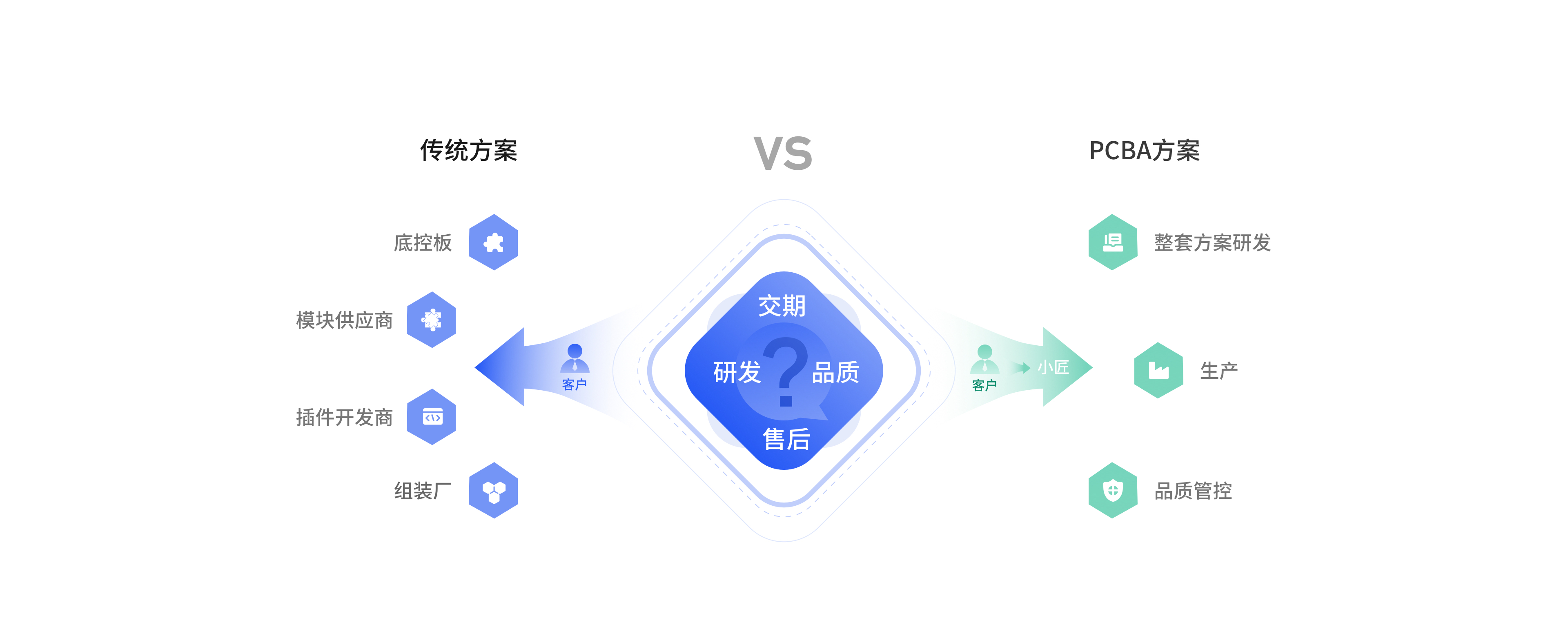小匠是以六轴传感、EMS脉冲调制输出、电机类驱动等技术为应用中心,在此应用中心上做横向扩展,实现项目快速落地能力。同时依托小匠在IOT方面丰富的开发生产经验及完善的测试方案,帮助客户贯通从产品定义、研发、生产、组装整条链路上的产品落地和品质管控问题,为客户节省沟通成本、时间成本、物料成本以及售后成本,提供客户更具有竞争力的产品方案。